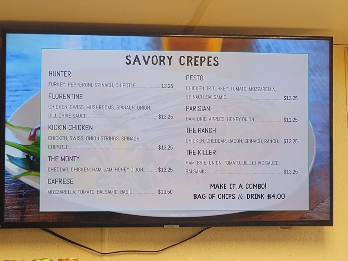 But the excitement doesn’t stop there! The savory offerings are just as tantalizing. The Chicken Florentine Crepe is a standout, filled with tender chicken, creamy Swiss cheese, and fresh spinach, all harmoniously blended with dill chive sauce. It’s a culinary embrace that will leave you wanting more. The Carnivore Crepe caters to hearty appetites, overflowing with rich meats and flavors that promise to satisfy even the hungriest of diners.